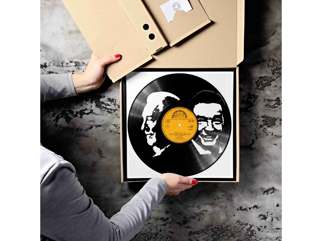 - Gramo obraz tvoří jedna vyřezávaná gramodeska o průměru 30 cm a rámeček se sklem o velikosti 310 x 310 x 15mm.