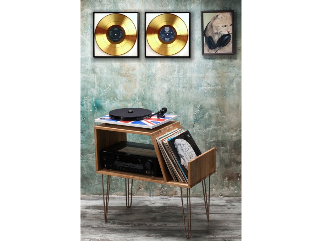 Gramodesku z pohledové strany chrání skutečné sklo, takže se nemusíte bát laciného vzhledu. Z druhé strany je kovový závěs pro umístění na stěnu.